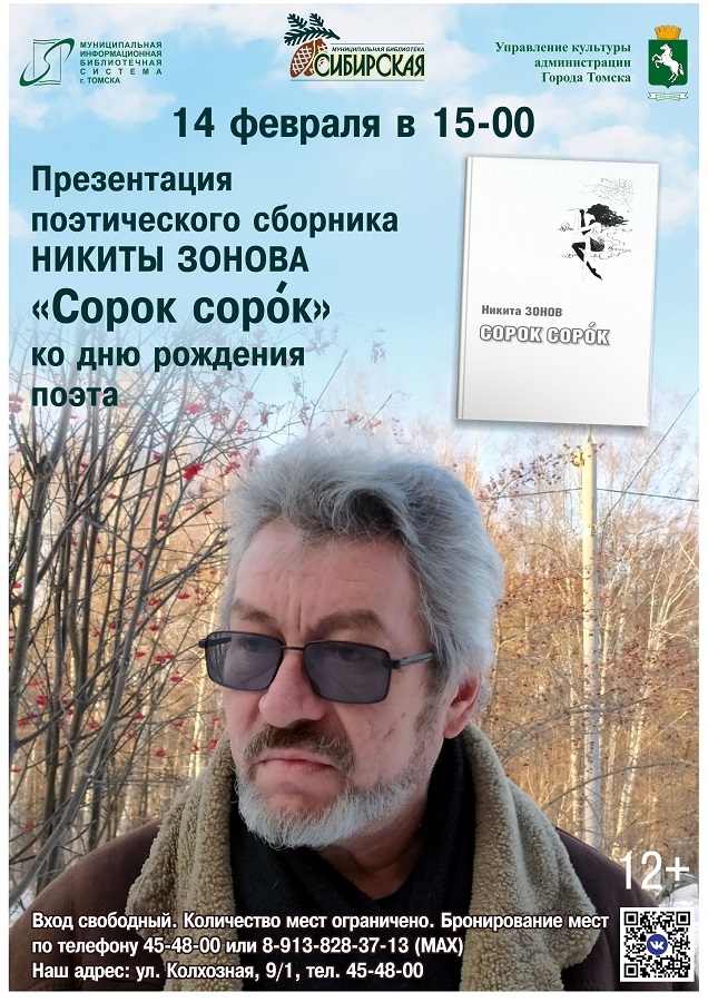 14 февраля в 15.00 в муниципальной библиотеке «Сибирская» (ул. Колхозная, 9/1) пройдёт презентация поэтического сборника Н. В. Зонова «Сорок сорОк». Автор представит новые стихотворения и сочинения прошлых лет, а также расскажет о своём творческом пути.Презентация сборника приурочена ко дню рождения поэта. Никита Владимирович Зонов - постоянный участник литературных встреч, автор публикаций в альманахе «Каменный мост», журналах «Сибирские огни», «Начало века», а также различных литературных изданиях. Сборник «Сорок СорОк» стал очередной вехой в творчестве автора. В книге собраны стихотворения, посвященные друзьям и знакомым, исцеляющей силе природы, ярким событиям жизни и т.д. Философский подтекст лирических произведений наводит читателя на размышления, открывая в каждой строке новые смыслы. В 2024 году творчество Никиты Владимировича получило признание на областном уровне - автор стал лауреатом Губернаторской литературной премии в номинация «Поэзия». 07.02.2026 г.