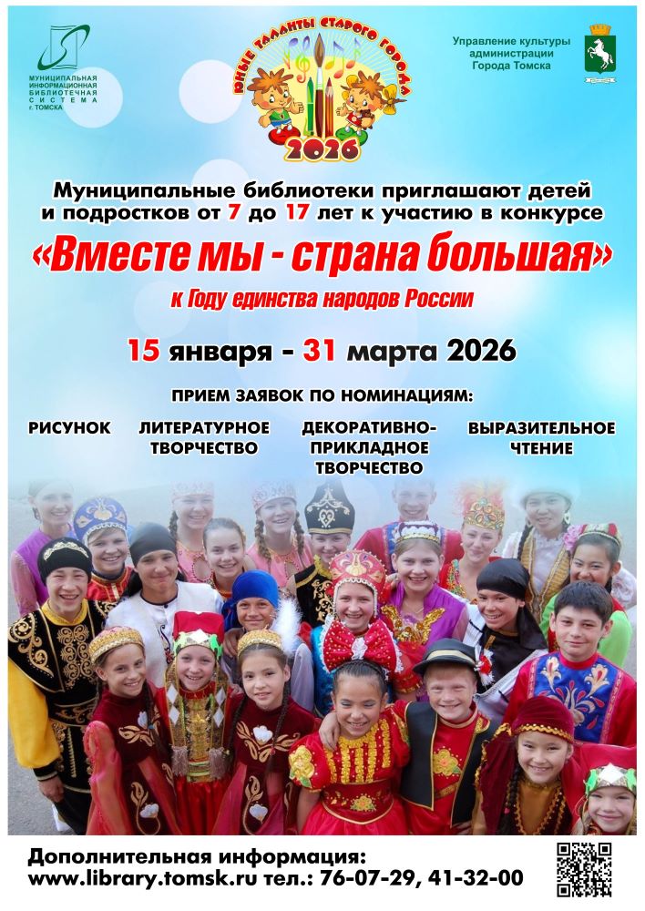 В библиотеках МАУ «МИБС» стартовал ежегодный городской конкурс детского творчества «Юные таланты старого города - 2026». Тема конкурса «Вместе мы – страна большая» посвящена Году единства народов России. Традиционный творческий конкурс организован МАУ «МИБС», муниципальными библиотеками «Кольцевая» и «Юность» при поддержке управления культуры администрации Города Томска. Соорганизаторами конкурса являются филиал «Дом дружбы» ОГАУК «Дворец народного творчества «Авангард» и МАОУ ДО «Детская школа искусств №3» Города Томска.
