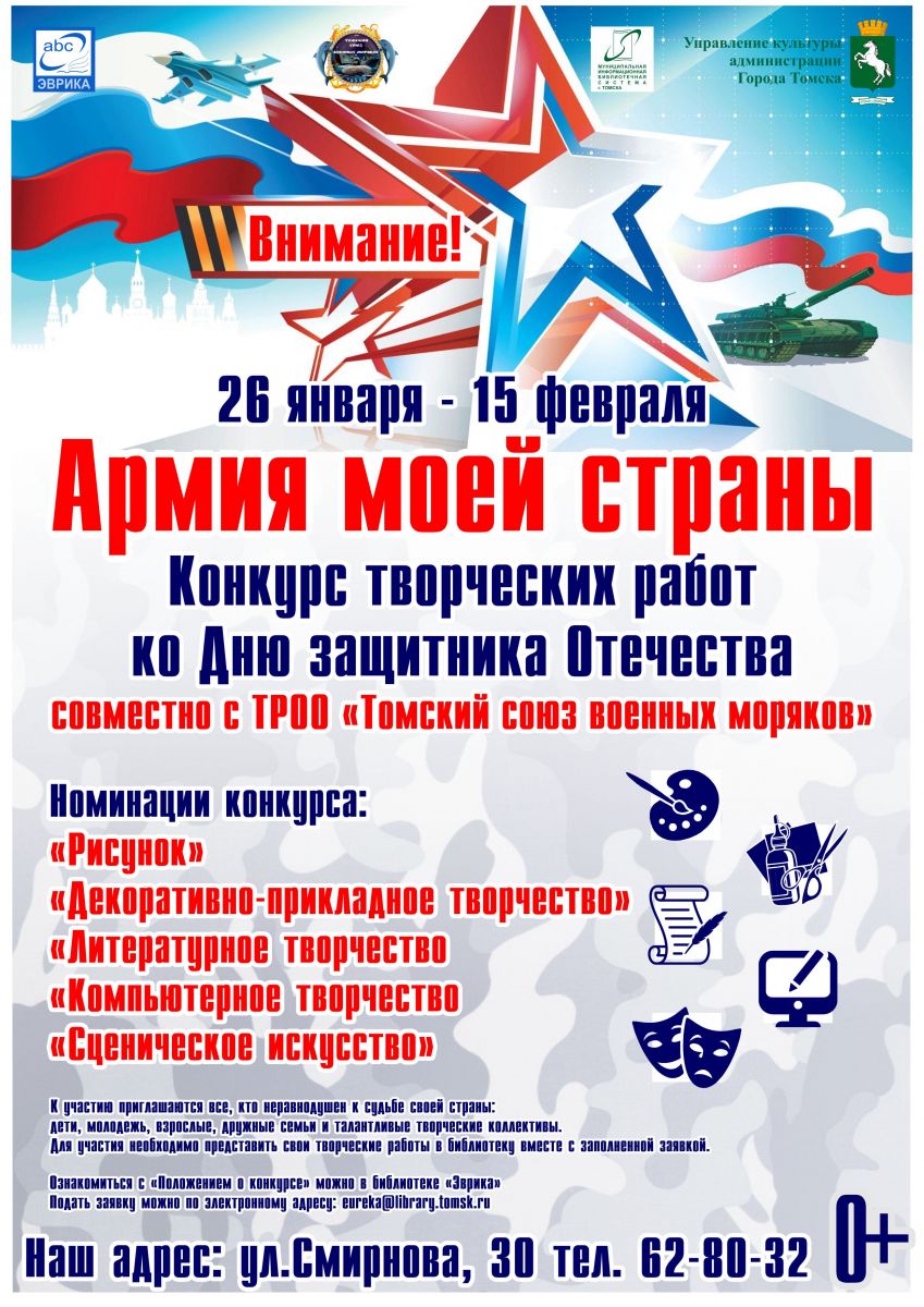 Муниципальная библиотека «Эврика» (ул. Смирнова, 30) приглашает жителей микрорайона Каштак принять участие в конкурсе творческих работ «Армия моей страны», приуроченного ко Дню защитника Отечества. Конкурс проводится при поддержке Томской региональной общественной организации «Томский союз военных моряков».В истории России было много великих сражений и великих побед, за которыми стояли сильные и отважные воины. Наше дело – чтить героев и память о них, отдавать дань уважения всем, кто защищал и защищает Родину, оберегает страну от врагов и борется за мир. Библиотека приглашает жителей Каштака всех возрастов стать участниками конкурса и представить свои творческие работы, посвящённые истории российской армии и её войскам, великим сражениям и героям Отечества. 30.01.2026 г.