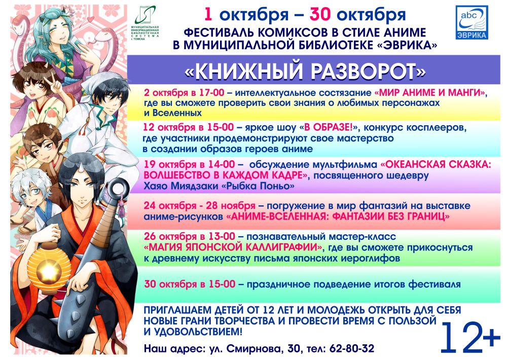 1 октября в муниципальной библиотеке «Эврика» (ул. Смирнова, 30) стартует фестиваль комиксов «Книжный разворот», который соберёт поклонников японской культуры и анимации. В течение месяца в библиотеке будут проходить конкурсы косплееров, мастер-классы, состязания знатоков и другие события, которые познакомят участников с популярным направлением современного искусства.Присоединиться к мероприятиям фестиваля можно в любой момент, обратившись в библиотеку «Эврика». Для участия в выставке «Аниме-Вселенная: фантазии без границ» все желающие могут представить свои работы в любой технике, включая цифровые рисунки. Основные требования к работам: формат А3, авторское исполнение и соблюдение тематики. Подробная информация о фестивале - на страницах библиотеки «Эврика» в социальных сетях «Одноклассники» и «Вконтакте». В программе фестиваля: |