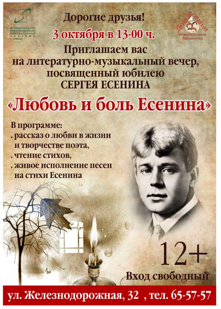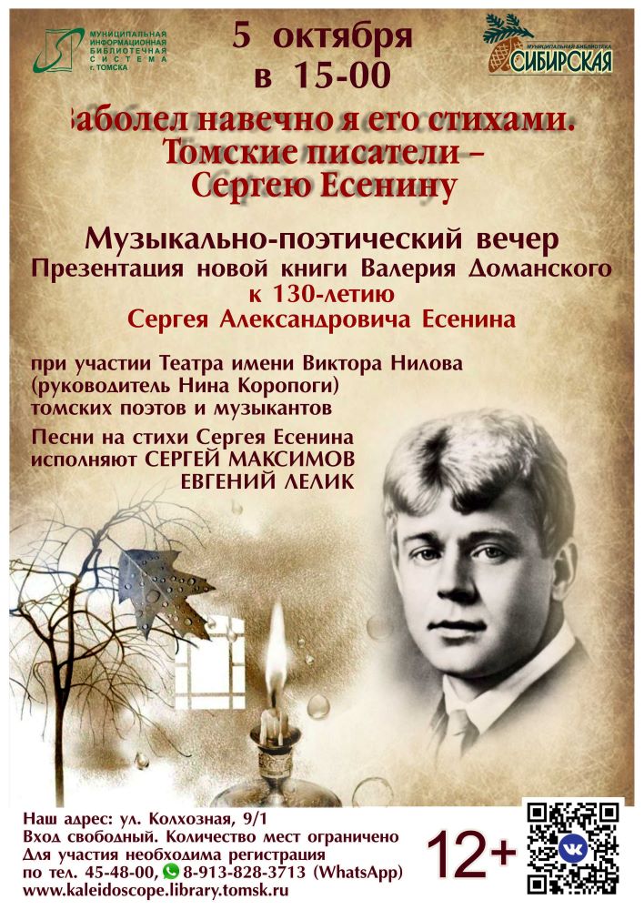 5 октября в 15.00 библиотека «Сибирская» (ул. Колхозная, 9/1) приглашает на музыкально-поэтический вечер к 130-летию С.А.Есенина «Заболел навечно я его стихами…". Томские писатели – Сергею Есенину». Для поклонников творчества поэта прозвучат стихотворения в исполнении томских чтецов, выступления С. Максимова и Е. Лелика, будут показаны театральные зарисовки в исполнении Театра им. В. Нилова, а также пройдёт презентация книги В. А. Доманского «Поэтическое мастерство Сергея Есенина».Вход на мероприятие свободный. Количество мест ограничено, для участия необходима запись по телефону 8 (3822) 45-48-00 или 8-913-828-3713 (WhatsApp) в часы работы библиотеки. Без предварительной записи посадочные места не гарантируются! 30.09.2025 г.