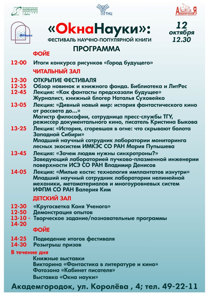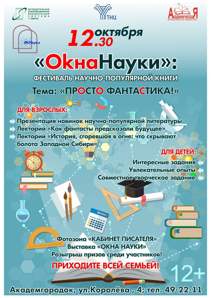 12 октября в 12.30 в библиотеке «Академическая» (ул. Королёва, 4) открывается фестиваль научно-популярной книги «Окна науки», организованный в рамках сотрудничества с Томским научным центром СО РАН. В 2025 году для фестиваля выбрана тема «Просто фантастика».Для взрослых посетителей пройдут лекции приглашенных гостей: книжного блогера Н. Суховейко, популяризатора науки К. Быковой, научных сотрудников М. Пупышевой, В. Денисова и В. Ким, а также обзор книжного фонда научно-популярной литературы библиотеки и викторина о фантастических вселенных. Дети смогут пройти интересные задания, поучаствовать в научных опытах и совместном творческом проекте. Для всех участников будет доступна фотозона «Кабинет писателя» и выставка «Окна науки». Также в рамках фестиваля запланированы: подведение итогов конкурса детских рисунков «Город будущего» и розыгрыш призов среди участников. Программа фестиваля. 02.10.2025 г.