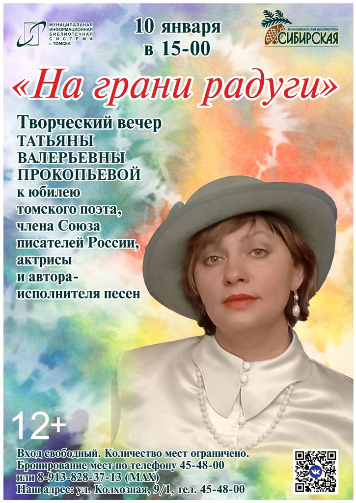10 января в 15.00 в муниципальной библиотеке «Сибирская» (ул. Колхозная, 9/1) пройдёт творческий вечер «На грани радуги», посвящённый юбилею томского барда и поэта Т. В. Прокопьевой. Лучшие произведения поэта прозвучат в исполнении автора, а также коллег по литературному цеху.Стихотворения Татьяны Валерьевны Прокопьевой никого не оставляют равнодушными. Лиричные и философские произведения вызывают в воображении читателей живые образы, затрагивают самые тонкие струны души и пробуждают глубокие эмоции. На вечере автор исполнит песни и стихотворения разных лет, расскажет о своём творческом пути и дальнейших планах. Прозвучат произведения из сборника «Новолуние», литературных журналов и альманахов. С поздравлениями Татьяне Валерьевне выступят представители литературного сообщества г. Томска, а также композиторы, музыканты и друзья автора. У посетителей будет возможность поделиться своими впечатлениями, выразить слова благодарности и поздравить юбиляра. Вход свободный. Количество мест ограничено. Бронирование мест по телефону 45-48-00 в часы работы библиотеки: вторник – воскресенье с 9.00 до 20.00, или на страницах социальных сетей: Вконтакте, Telegram. Без предварительной записи посадочные места не гарантируются! 01.01.2026 г.