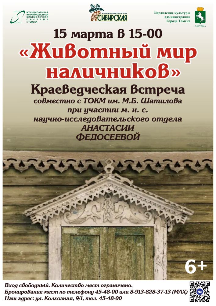 15 марта в 15.00 в муниципальной библиотеке «Сибирская» (ул. Колхозная, 9/1) пройдёт краеведческая встреча с младшим научным сотрудником Томского областного краеведческого музея им. М. Б. Шатилова А.С. Федосеевой «Животный мир наличников». Специалист музея познакомит посетителей с богатым символическим миром русского деревянного зодчества и расскажет об использовании образа животных в декоре наличников России и Томской области.Изображения животных широко распространены в архитектуре разных стран. Особое место они занимают в российском зодчестве, выполняя как декоративную, так и символическую функцию. На краеведческой встрече гости познакомятся с оформлением наличников разных регионов России изображениями животных и мифических существ, узнают их исконное значение, а также увидят примеры подобных орнаментов на современных наличниках. 12.03.2026 г.
