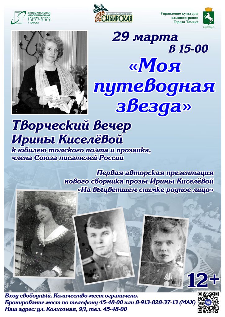 29 марта в 15.00 в муниципальной библиотеке «Сибирская» (ул. Колхозная, 9/1) пройдёт юбилейный творческий вечер И. В. Кисёлевой «Моя путеводная звезда». Томский поэт и прозаик, член Союза писателей России расскажет о своём творческом пути и представит новый сборник прозы «На выцветшем снимке родное лицо», а приглашенные гости и друзья автора выступят с концертными номерами.В творчестве Ирины Викторовны Киселёвой сочетаются лучшие черты отечественной литературы - лиричность, психологическая точность и яркие сюжетные контрасты. На юбилейном вечере перед зрителями предстанут художественные образы из книг Ирины Викторовны, прозвучат отрывки из произведений и авторские комментарии. Особенным событием станет презентация нового сборника прозы «На выцветшем снимке родное лицо», посвящённого переосмыслению прошлого. 20.03.2026 г.